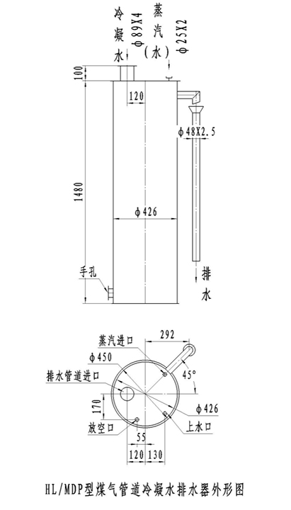 2、本設(shè)備為高壓單管排水器,排水采用雙室式水封,水封高度為3750mm,采用蒸汽保溫。