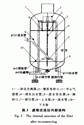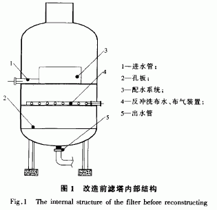污水站采用的過濾裝置為普通平流濾塔(高4 m,直徑2.3 In),改造前濾塔內(nèi)部結(jié)構(gòu)見圖1。該濾塔采用雙層濾料,上層為石英砂,下層為水淬渣,反沖洗方式采用大阻力配水系統(tǒng)氣水聯(lián)合反沖洗。平流濾塔存在的問題:①反沖洗采用大阻力配水系統(tǒng),每天反沖洗15n1in,消耗大量水資源和電能;② 在傳統(tǒng)的常壓反沖洗系統(tǒng)中,存在著反沖洗不徹底、濾料需要定期更換的問題。