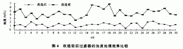 改造后過濾器和未改造過濾器運(yùn)行30 d的出水濁度數(shù)據(jù)見圖4。