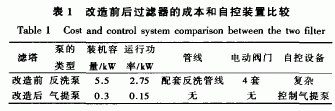 由表1可見,改造后的連續(xù)動態(tài)過濾器與改造前的普通過濾器相比,其裝機(jī)容量大幅降低,折合到24 h進(jìn)行比較,其運(yùn)行功率減少了50%,反沖洗自控裝置簡化。因此連續(xù)動態(tài)過濾器的設(shè)備成本和運(yùn)行成本均優(yōu)于普通過濾器,而且操作簡單,運(yùn)行安全。